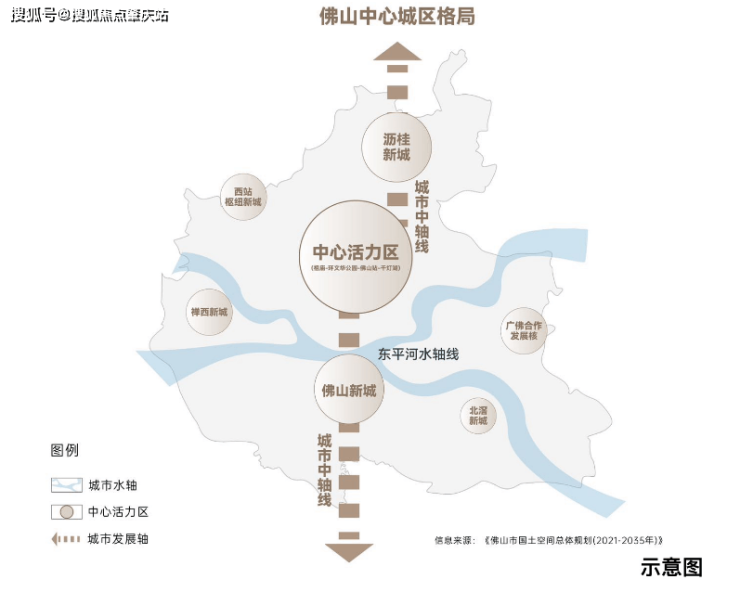 根据《佛山国土空间总体规划(2021-2035)》,构建“一核三心、双轴多片”的空间结构,首次定调”佛山中轴线x东平河水轴线“城市双中轴发展概念。
