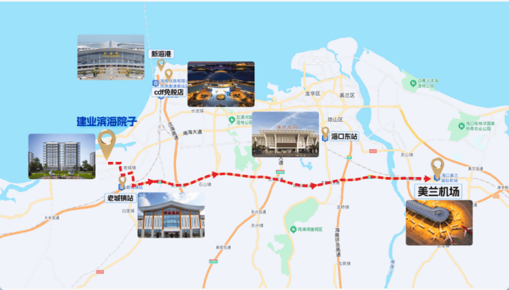 高铁+高速立体交通:项目距老城镇高铁站3.3km,15分钟直达海口东站;到全球最大单体免税店--cdf海口国际免税城约18分钟车程、到海南出入岛的重要港口新海港约20分钟车程、到海口美兰国际机场约25分钟车程;金马大道快速化改造完成,避开拥堵,通勤效率提升40%;马村港货运枢纽5公里,生鲜物流极速达,生活物资更新鲜。
