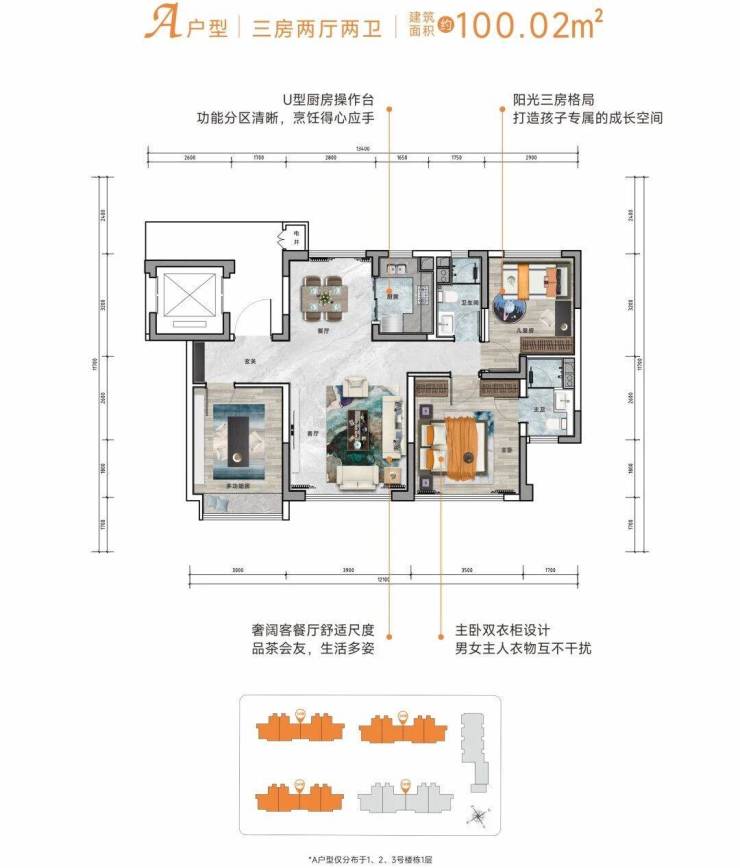 户型格局分为三房两厅两卫,四房两厅两卫等,面积约 100-129㎡,户型方正、通透舒适,大阳台设计,景观丰富、视野开阔。