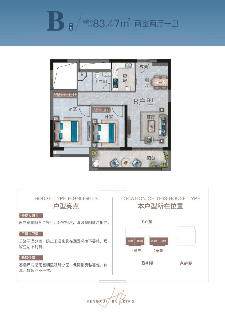 B户型: 83.47㎡ 三房两厅一厨一卫
