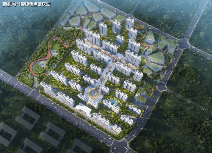 建筑规划:项目共规划 38 栋建筑,包含 32 栋住宅楼及 4 栋独立商业楼,整齐划一排布在方正的地块上。
