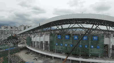 ▲肇庆市体育中心体育场外立面正在搭建幕墙框架