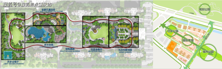 地块引入城市公园和社区公园,直面城市公园的青年社区,城市公园串联三个住宅区块:引入青年运动,儿童乐园,老年活动和公园商业概念;社区公园设有运动、老年活动等让每个区块能够实现共享实用。