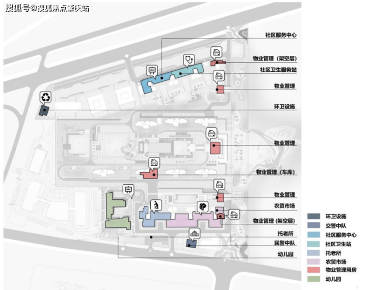 ② 北地块设置有社区服务中心,社区卫生站及配套商业;