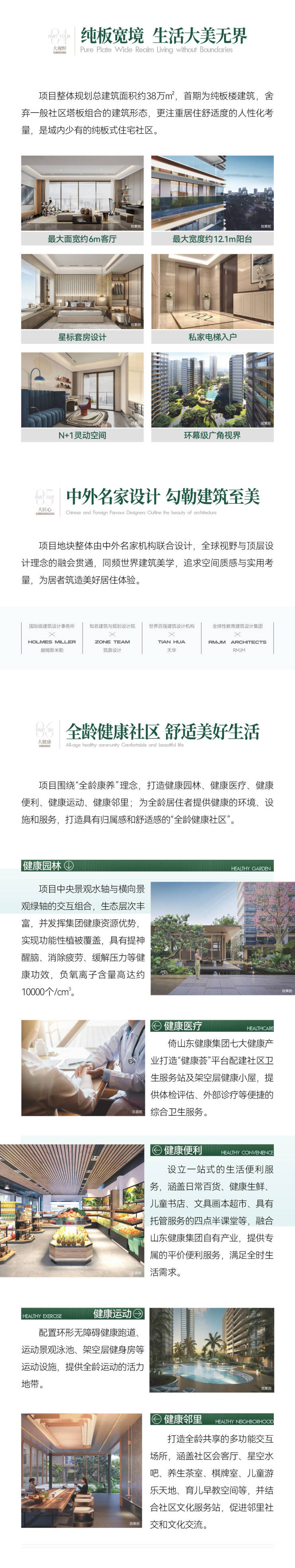 作为省属国企山东健康集团力作,项目雄踞江东新区 CBD 南芯,总占地 253 亩,以容积率 3.03、 、绿化率 35.1% 的低密规划,打造全龄健康社区范本。承袭 “六位一体” 健康体系,融合太阳能、雨水回收等绿色技术,筑就 7 - 17 层精工洋房与小高层,户户享全明通透格局。