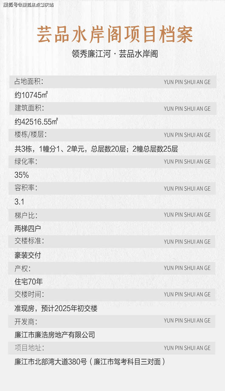 芸品水岸阁是由廉江市廉浩房地产有限公司开发的精品住宅项目,以下将从其基本信息、楼盘特色、周边配套等维度展开详细介绍:
