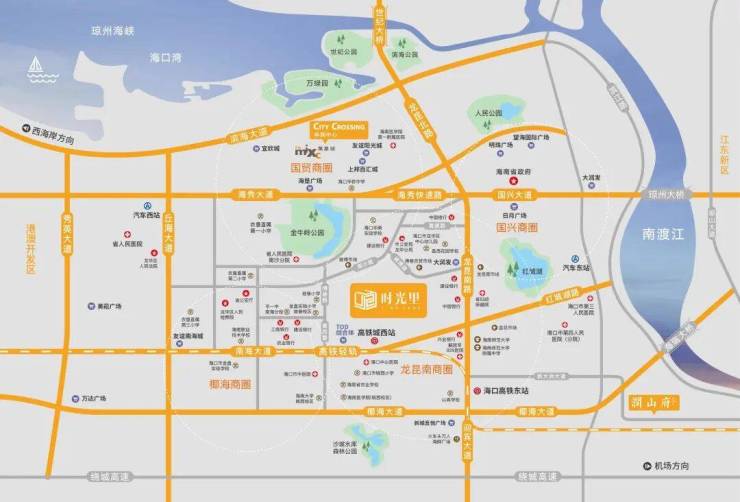 ● 时光里项目位于海南自贸港省会城市:海口龙昆南板块。区域内,多家世界500强集聚、超200亿元投资、TOD百亿商圈阵容、前后双公园(金牛岭公园+红城湖公园),优享约3公里醇熟生活配套。