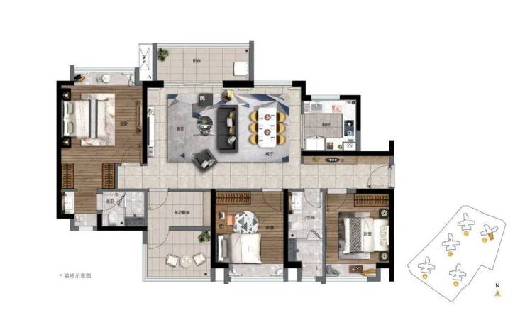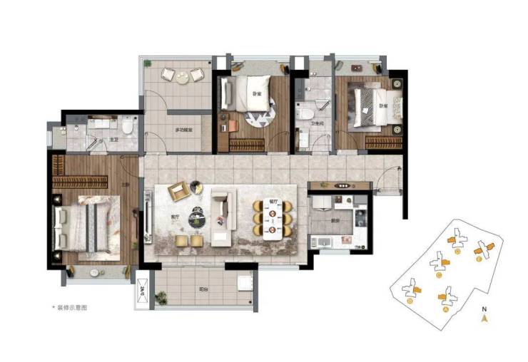 ● 阔景阳台 ● 拓容客厅 ● 私密卧室 ● 科学U型厨房 ● 多功能空间