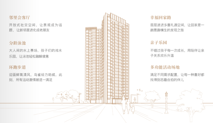 项目引进华润置地景观“润享家”体系,以人为尺度,努力创造温暖、活力、友善、包容的社区空间,邻里会客厅、分龄泳池、环跑步道、亲子乐园、多功能活动场地、幸福回家路等社区配套,为业主提供沉浸式家庭社交景观,满足不同喜好的人们对美好生活的向往。