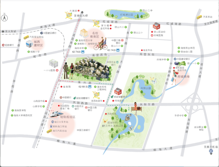 教育圣地:项目正对面即是海南最知名学府:海南中学,周边还环绕海师附小,琼山二小,海师附中,海南师范大学等知名学府,16 年一贯制全龄教育近在家门口