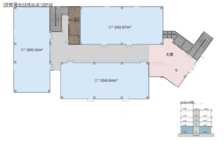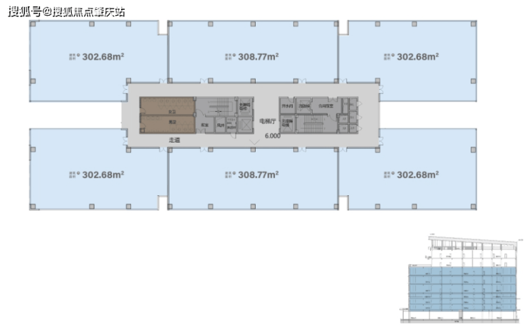 3# 楼:约 301-322㎡商务空间,首层 6 米层高,2-4 层 3.6 米层高,5-9 层 5.4 米层高。