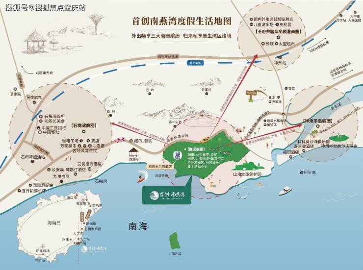 沿109公里海岸线分布的日月湾、石梅湾、南燕湾、神州半岛四大海湾,南燕湾位居其中心,近享威斯汀、艾美、君悦等豪华度假酒店、神州高尔夫、游艇码头等醇熟配套,又独享静谧的一线山海,远离喧嚣。