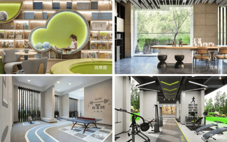 项目配套:多功能娱乐厅、文艺书吧、阅读室、DIY室、健身休闲中心、棋牌室、茶饮室、户外水景等全时段配套
