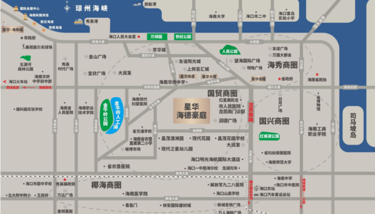 国兴大道沿途分布了省政府、省图书馆、省博物馆、省歌舞剧院等省级公共资源配套。龙昆南路沿线连接贯穿国贸、海秀、国兴等商圈,各商圈距离项目仅3公里左右,龙昆南主城区是集海口的交通、金融、商业、文化、行政五大中心为一体的成熟商务区。