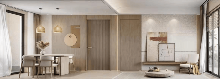 归山海择雅居 精琢生活质感项目建筑简雅美观,白色墙面基调,与铝板线条、木质颜色结合,简洁素雅。铝板、真石漆、low-E玻璃幕墙、仿石砖、玻璃栏杆等所用材质健康环保,尊配品牌智能家装。