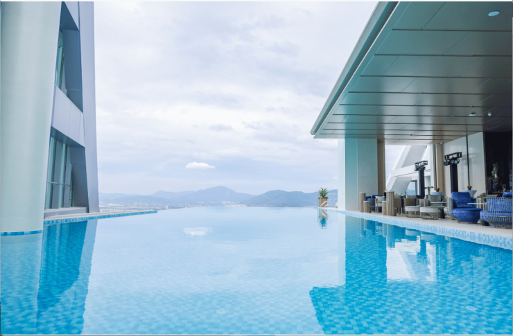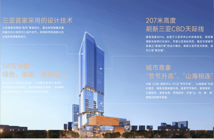 中粮(三亚)国贸中心 ITC,建筑高度约207米,是目前三亚的城市至高点,其秉承国际标准,贯穿绿色、低碳、智能的设计理念,拥有360°环绕视野,以城市意象、开放空间、高效办公为理念,打造城市办公绿洲,同时也是一座集OA(办公自动化系统)、CA(通讯自动化系统)、FA(消防自动化系统)、SA(安保自动化系统)、BA(楼宇自动控制系统)为一体的5A甲级标准写字楼。