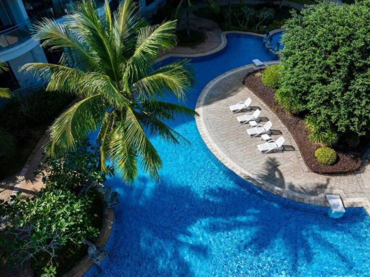 配有酒店2000㎡超大景观泳池(已投入使用);800㎡标准泳池(在建中),将规划20m×40m专业赛道