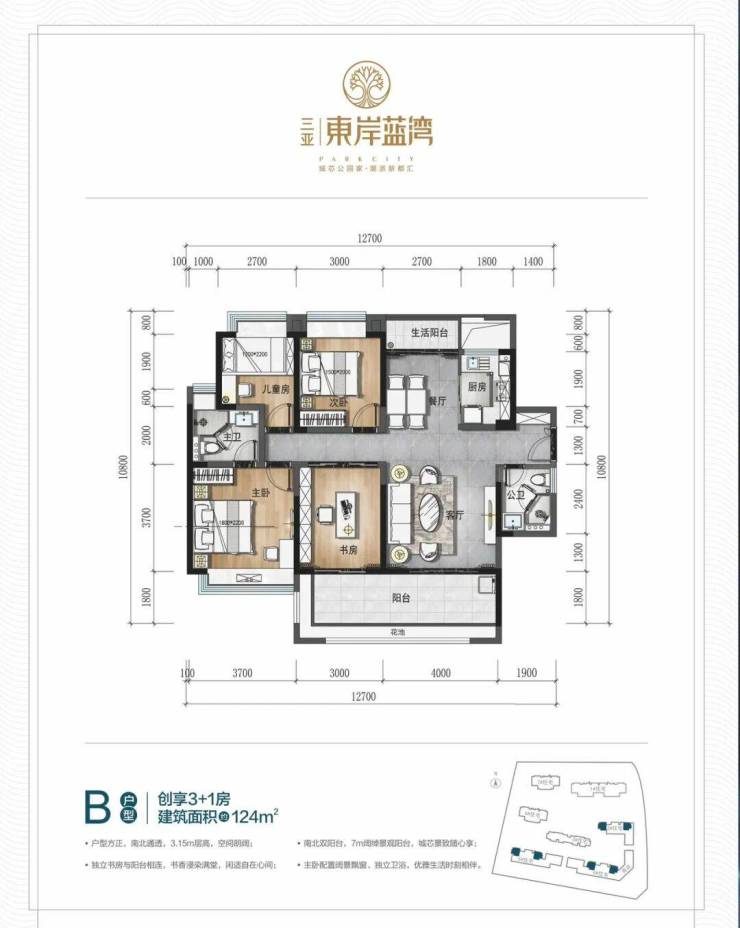 ▼B户型:建面约124㎡创享3+1房