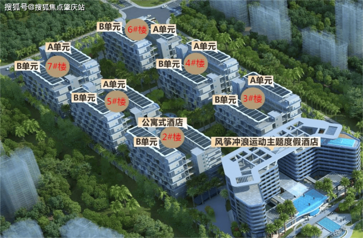 建筑布局:7 栋 6 层建筑(含 1 栋运动主题酒店),首层层高 5.8 米,标准层 5.6 米。