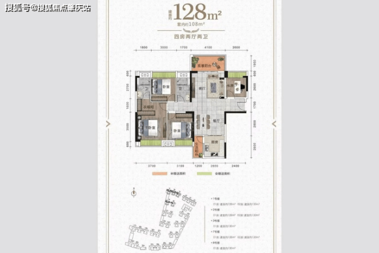「建面约128㎡四室两厅两卫」
