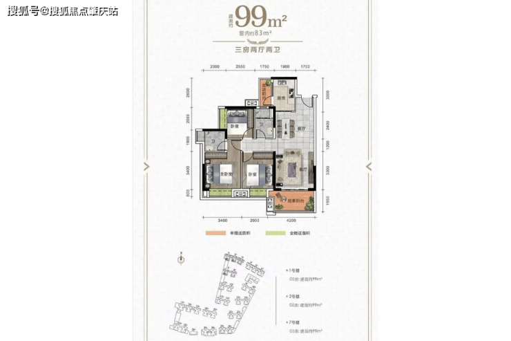「建面约99㎡三室两厅两卫」