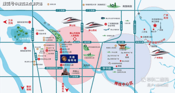 ②区位优越:桂丹路旁,半小时通达广佛 天晟海琴湾地处丹灶金沙核心区,紧邻桂丹路主干道,”四横六纵“快速路网,1个红绿灯直达千灯湖,出入即享广佛双城繁华配套; 1)三横: 广三高速、桂丹路(1个红绿灯直达千灯湖)、季华路西延线、广台高速。 2)六纵: 广州绕城高速、樵丹路、樵金路、佛山一环、广佛高速、广佛江中高速; 3)季华西延线(即将开通): 15分钟直达禅桂中心