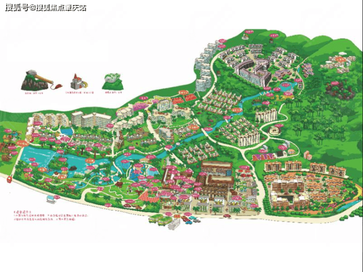 主题设施:打造了七大公社,三大主题公园、两条水系、一座生态示范城,为不同年龄段的业主提供了丰富的活动场所和度假方式。其中包括占地约 600 亩的山顶公园、延溪而下 30 余米高差的溪谷公园以及占地 80000 平米的湿地公园。
