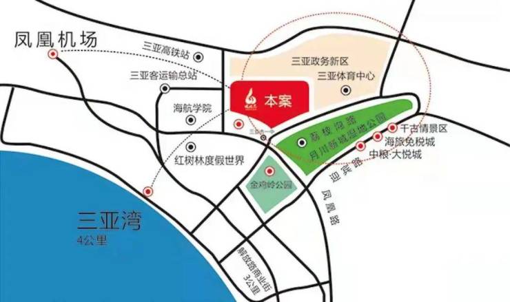 三亚体育中心、三亚市第一中学、三亚迎宾路商业中心、海旅免税城、中粮大悦城、东岸湿地公园、千古情景区、火车头万人海鲜广场