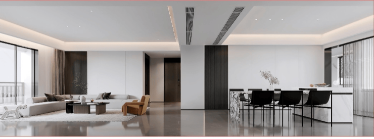 以简洁现代的线条手法诠释人居合一的理念。整体关系简约大方,强调整体关系和横线条为主。