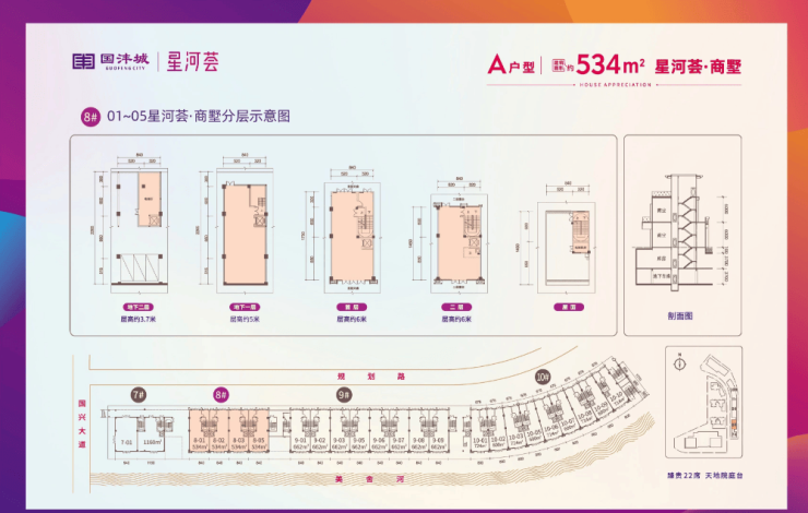 商墅户型:建面约 534-1160㎡,臻贵 22 席,一、二楼双 6 米挑高,开间约 8.4-14.5 米,户户临河临街,负二层私享车位。