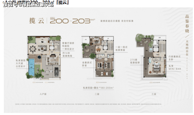 A 户型:建筑面积约 200-203㎡(双拼、独栋),总价 1500-2350 万,使用面积 390㎡,地上三层,庭院面积 190㎡,4 房 3 厅 5 卫。入户层为私家庭院大尺度公区设计,带泳池,客餐厅厨房和庭院一体化设计;二层是休息区域,有三个卧室,南北朝向,带空中露台;三层为行政套式主卧,有环绕式露台,270 度观景视野。