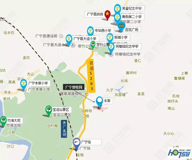 地块4公里范围内有9所中小学,教育资源配套丰富。4公里范围内有竹海大观、宝淀山景区、翠竹公园等,景观资源丰富,居住环境优越。距离省道S263约700m,距离贵广高铁广宁站约2.2km,但周边农田居多,道路不通,出行较为不便。