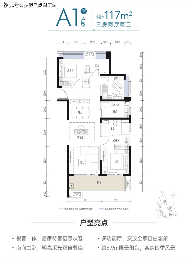 户型亮点:超 6m 宽景观阳台、多功能厅、餐客一体、主卧套房设计、全明飘窗,部分户型客厅与主卧连通东向约 7.2 米宽的大观景阳台。