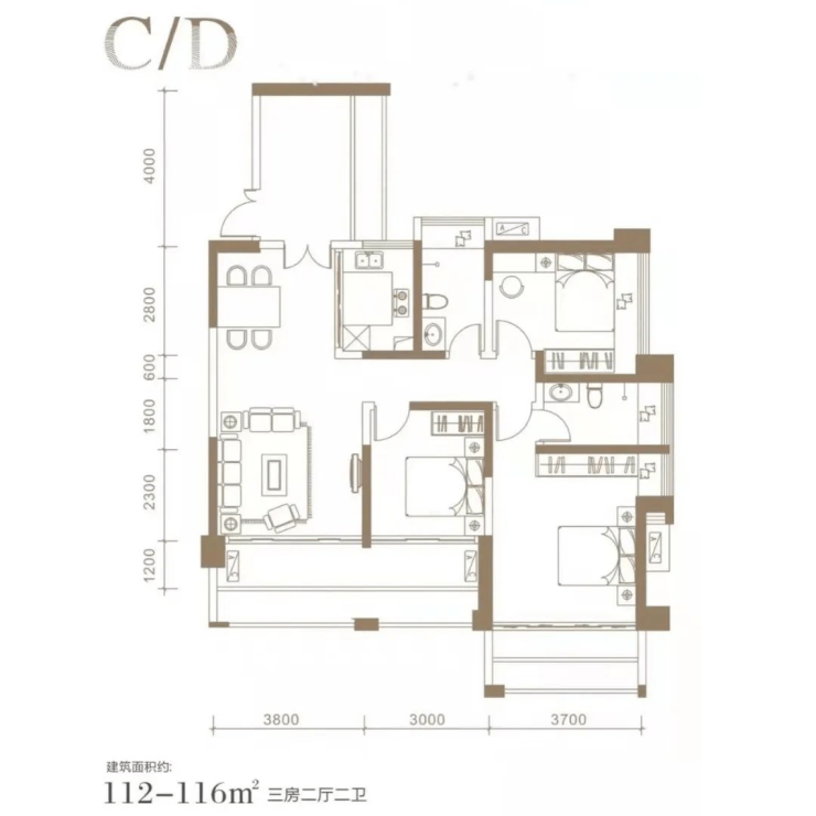 户型种类:有 112-116㎡、142-145㎡的三房,以及 160-163㎡的四房。