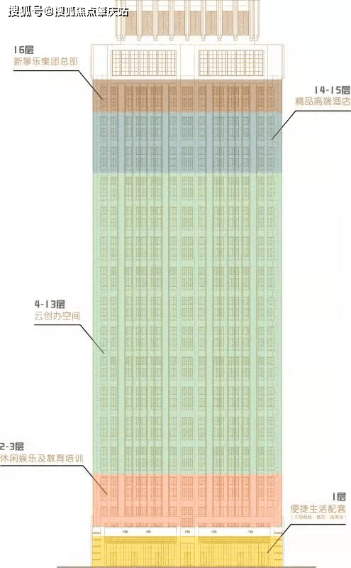 楼栋业态:1层便捷生活配套、2-3层休闲娱乐及教育培训、4-13层云创办空间、14-15层精品高端酒店、16层新攀乐集团总部