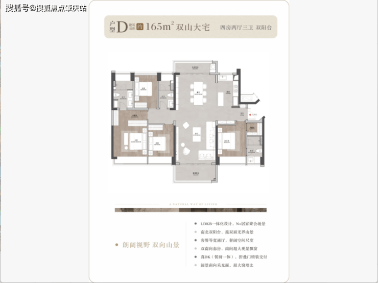 户型背山面海,超大的窗墙比将窗外无价的山海资源揽入户内,所有户型都可以看到开阔的山景,部分户型高楼层可以同时看到山海景观;南向大面宽、小进深,结合现代人家居理念的LDKB一体化设计,打造城市之芯的巨幕山海。