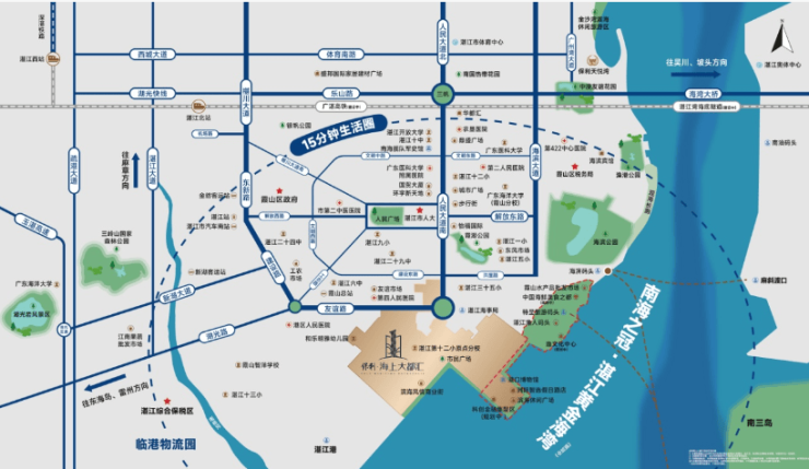 出行便捷:项目坐落于三条主干道(人民大道,椹川大道,海滨大道)交汇处,便捷交通畅达全城。距离湛江北站(建设中)约8公里,快速接驳广佛珠三角等。