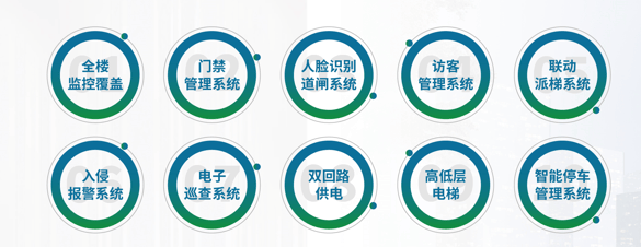IBMS智能建筑集成管理中控系统,十大智能体系加成,全楼监控覆盖、门禁管理系统、人脸识别道闸系统、访客管理系统、联动派梯系统、入侵报警系统、电子巡查系统、双回路供电、高低压电梯、智能停车管理系统。