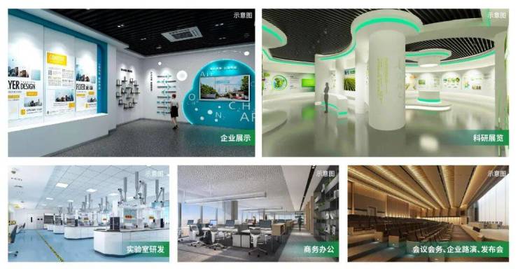 室内空间灵活组合,满足企业展示、科研展览、实验室研发、商务办公、会议会务全方位需求