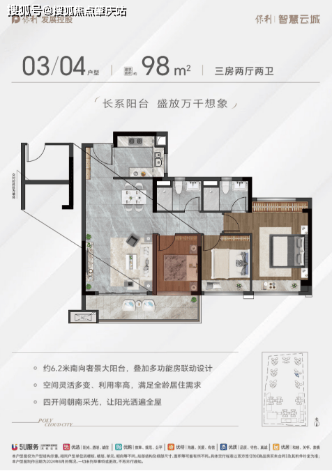 98㎡(享受型三房)—— 四开间朝南,6.2m南向奢景大阳台