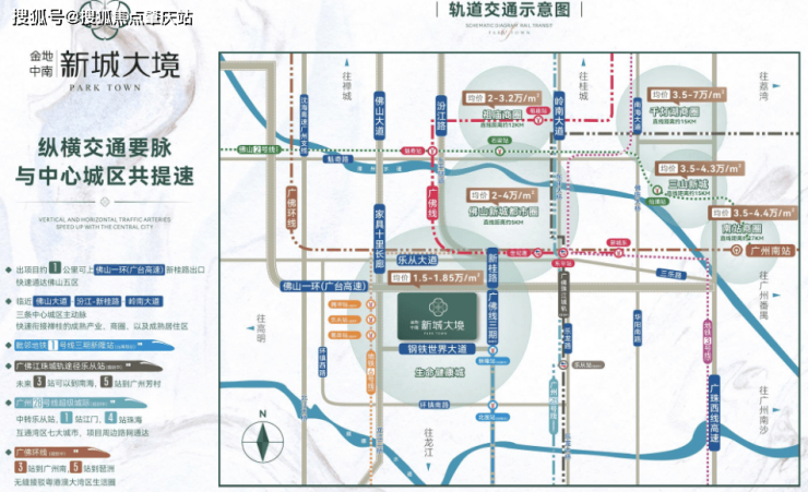 在轨道交通方面:步行约 600 米到达佛山一号线三期新隆站,直接连同禅城、桂城和广州, 未来 3 站可以到达佛山新城,4 站通城南。(目前规划中) 另外连接广州、佛山、江门和珠海四个大湾区核心城市的广佛江珠城轨,其中一个站点—— 乐从站,也设在项目周边,可以非常方面去到这四个城市。