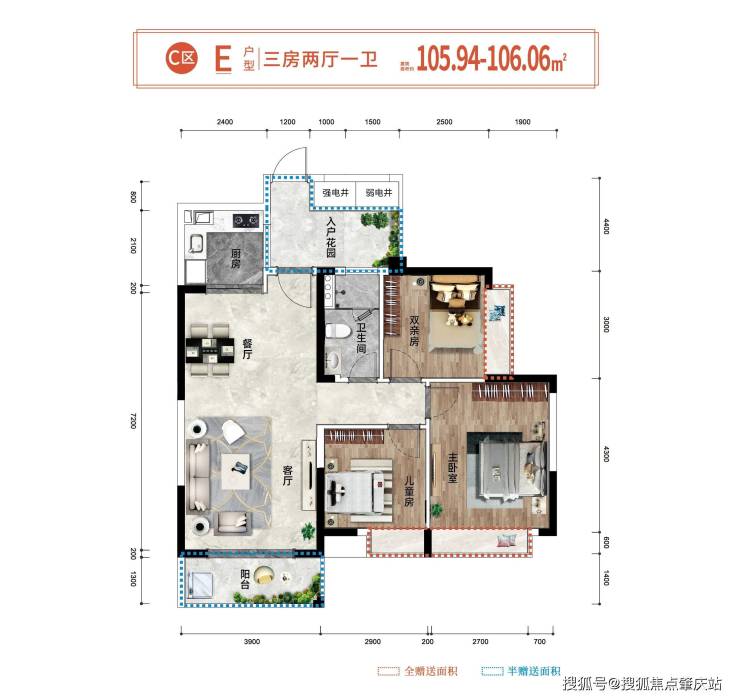 🏖E户型约105.94㎡(三房两厅一卫)