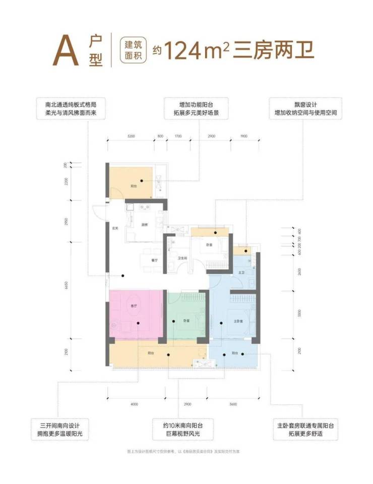 主力户型:有建面约 105㎡的三居室和 124㎡的三居室,均为南北向板楼结构,三开间朝南,拥有约 10 米超宽南向阳台,约 1.9 米进深。