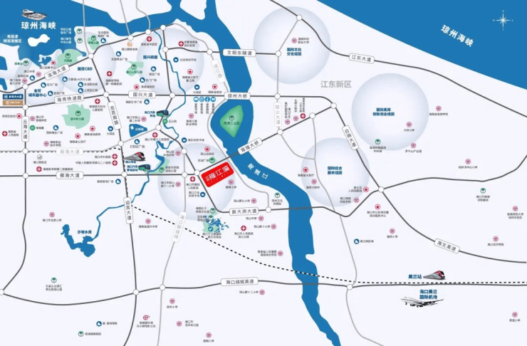 交通配套:项目紧邻城市主干道新大洲大道,北侧为椰海大道,西侧新大洲大道毗邻海口联络线,可通向海口绕城高速、琼州大道等。此外,距海口东站约 4.1 公里,距城西站约 5.6 公里,距海口汽车客运总站约 4 公里,距海口美兰机场约 10 公里。