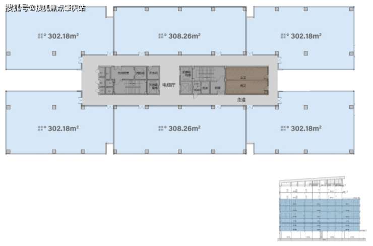 11# 楼:约 307-311㎡商务空间,首层 5.4 米层高,2-3 层 3.6 米层高,4-5 层 5.4 米层高。