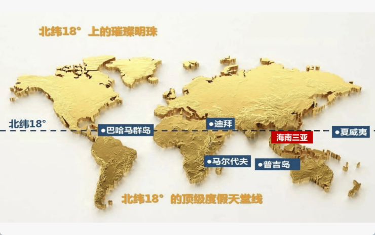 乐东是海南省直辖自治县,位于海南岛西南部,东和东北与五指山市、白沙黎族自治县接壤,东南与三亚市交界,北与东方市、昌江黎族自治县毗邻,西南临南海,海岸线84.3公里。地势北高南低,背山面海,年平均气温26°C,PM2.5指数全年为优,森林覆盖率约68%,最主要的是处于北纬18º线。全球理想的度假胜地基本都分布在这个纬度上,从墨西哥坎昆到美国夏威夷和迈阿密,从圣地亚哥到马尔代夫,从印尼的巴厘岛到泰国的芭提雅,从阿联酋迪拜到再到海南三亚,这些著名的岛屿就像璀璨夺目的珍珠一样一颗一颗地镶嵌在这个纬度上,缠绕地球一圈,号称“黄金纬度”。