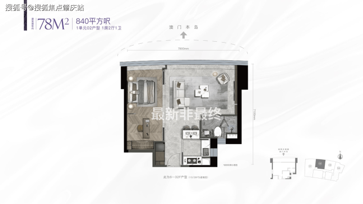 1房2厅1卫,超8米绝版景观面,看一线海景、澳门景,户型方正实用,配有明火厨房