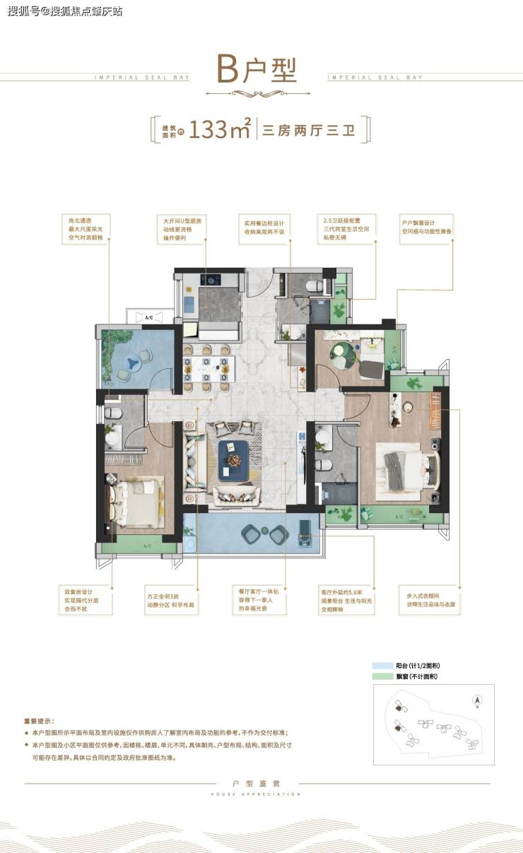 【B户型】-133平1、南北通透,最大尺度采光,空气对流顺畅2、双套房设计,实现隔代分层,合而不扰3、户户飘窗设计,空间感与功能性兼备4、方正全明3房,动静分区,科学布局