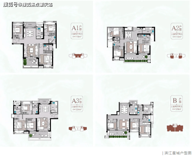 主要产品面积为 110-129㎡,户型为三房两厅板式大宅。
