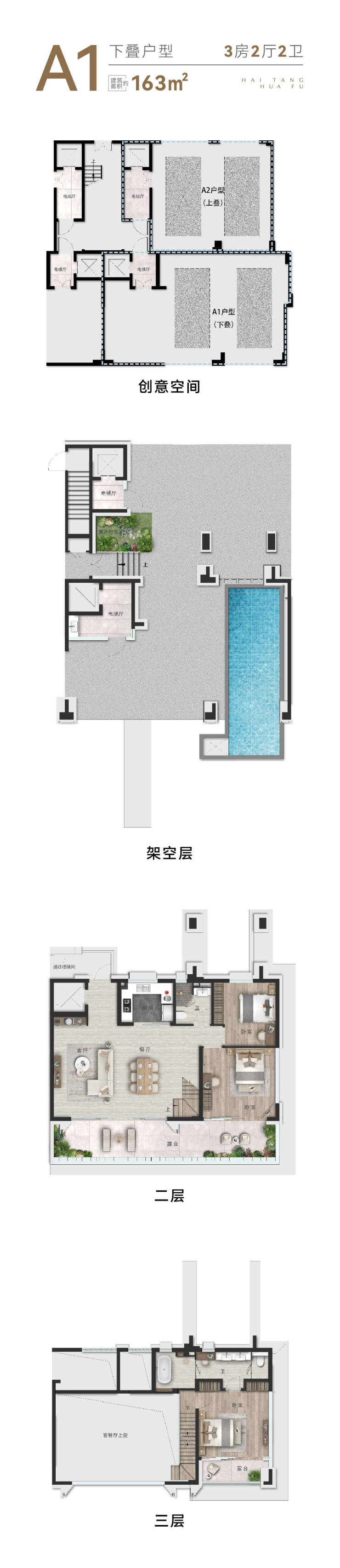 低密栖海叠拼:上叠约165㎡,下叠约163㎡